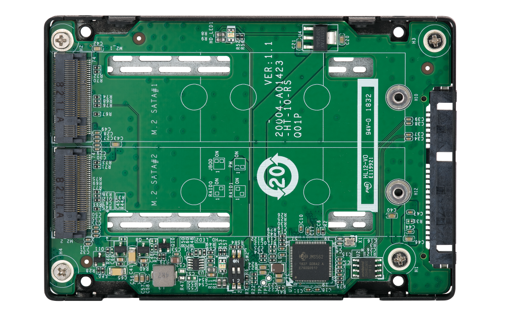 Use two M.2 SATA SSDs in a single 2.5-inch SATA drive bay with RAID support for PC and NAS