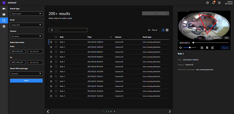 Los NVRs son compatibles con la administración de alarmas y la búsqueda de eventos con la tecnología deep-learning de VIVOTEK, Smart VCA. El usuario puede buscar por uno o varios tipos de eventos, reproducir eventos de alarmas y también exportar los videos de la busqueda.