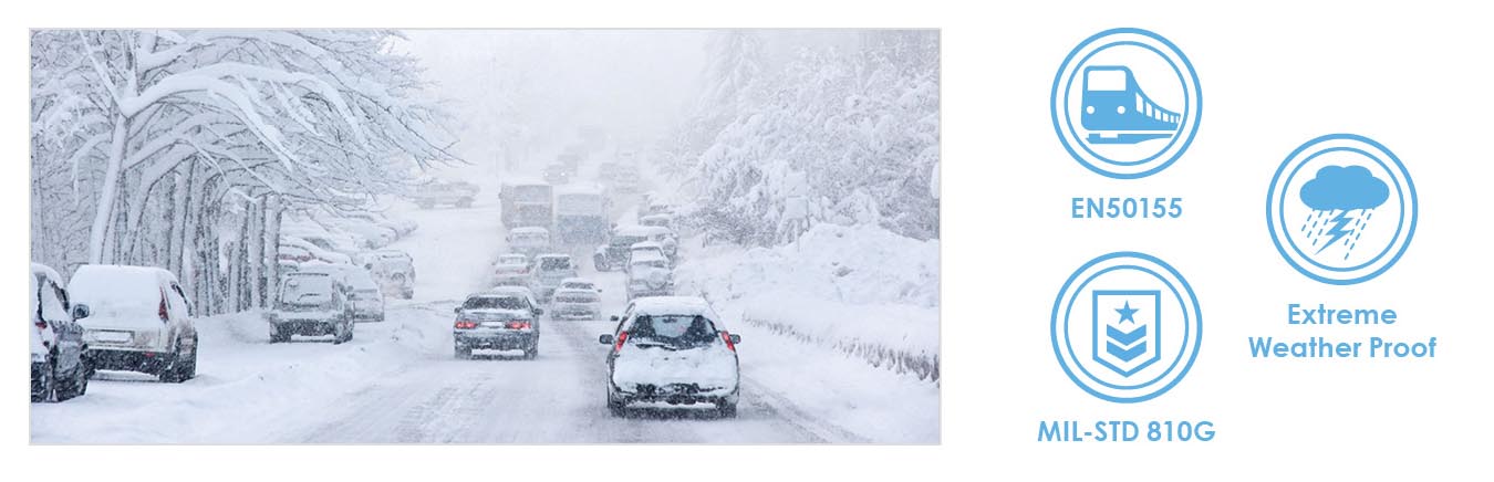 El cumplimiento de las normas de transporte EN50155 y MIL-STD-810G, garantiza el cumplimiento de los requisitos antivibratorios y antichoques, la operabilidad en condiciones difíciles, como temperaturas bajas extremas, alta humedad, e incluso brinda protección contra sobretensiones.