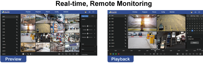 El NVR-1600 viene con interfaces de salida de video HDMI y VGA para pantalla local dual. Se puede conectar a un monitor HDMI 4K y a un monitor VGA 1080p por separado, donde los contenidos de visualización en directo o los contenidos de reproducción se pueden mostrar simultáneamente. Con la función de pantalla local dual, los usuarios pueden monitorear localmente con alta flexibilidad en una resolución de pantalla diferente, eliminando así la necesidad de una PC separada para ver video desde la unidad. Además, el NVR también se puede operar con el mouse USB para configurar y monitorear todos los sistemas fácilmente.