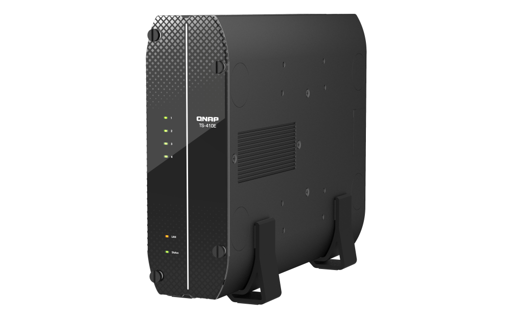 El NAS 2,5GbE profesional TS-410E está diseñado para funcionar en entornos sensibles al ruido. Con un diseño sin ventilador y un chasis sólido, el TS-410E se puede colocar en vertical para ahorrar espacio en el escritorio. También se puede configurar la caché SSD para que la E/S se acelere y destaque en aplicaciones exigentes.